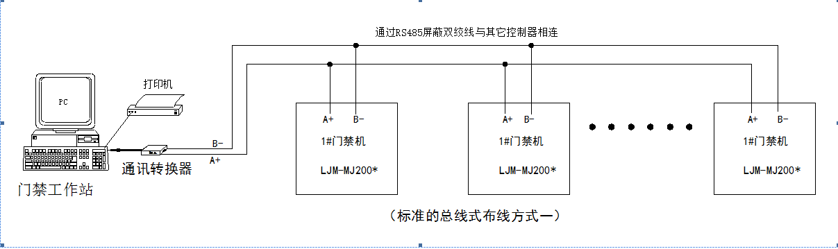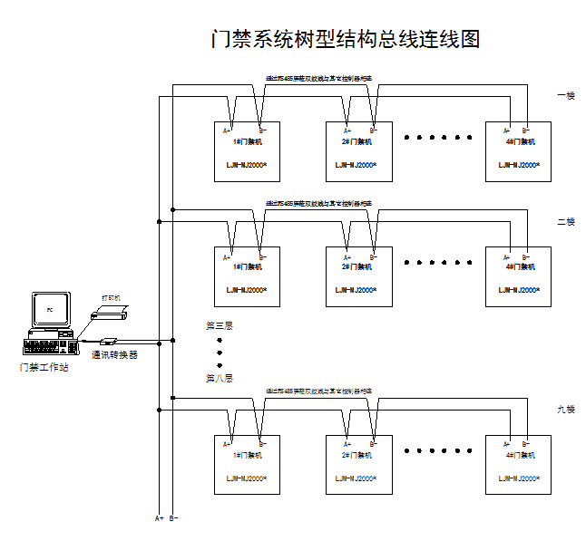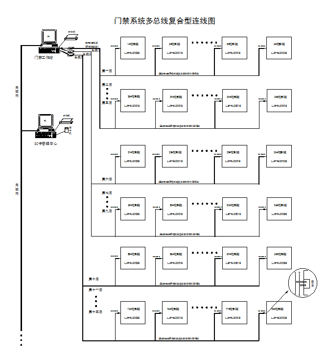 b、多總線復(fù)合型布線方式,一般在大型門禁系統(tǒng)中使用;因大型門禁系統(tǒng)的點數(shù)較多且分散,一般一條總線滿足不了需求(受通訊距離與轉(zhuǎn)換器帶負(fù)載能力的限制),且在實際施工中有時按標(biāo)準(zhǔn)的總線式結(jié)構(gòu)布線還不好走線,因此在大的小區(qū)或者大廈項目中經(jīng)常采用多總線復(fù)合型方式布線: